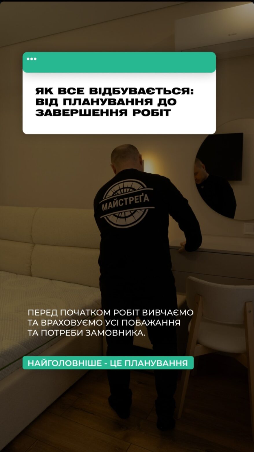 В нас в пріорітеті якість та чистота на кожному етапі, економія ваших коштів, погоджуємо усе з Вами, а виконуємо все самі. Ну і звісно кінцевий результат, щоб замовник був задоволений, що обрав саме “Майстреґу”.